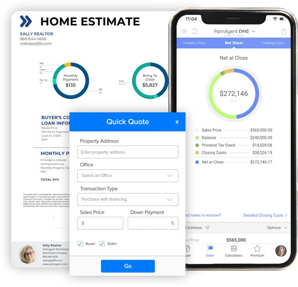 PalmAgent is Real Estate's top choice for Net Sheets and Closing Cost estimates. From the convenience of a desktop, tablet, or phone - your fully native app comes complete with county-specific closing costs, title and escrow rates, taxes, and other fees - PalmAgent has dozens of powerful Real Estate calculators to give your agents a leg up on the competition.